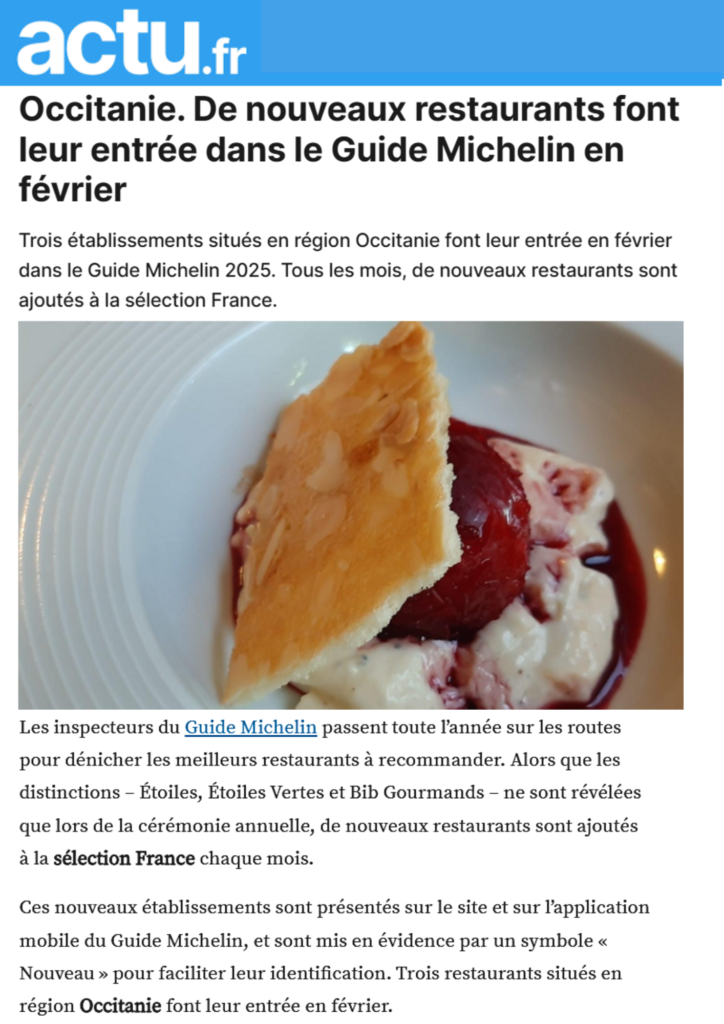 Article en entier : https://actu.fr/occitanie/laguepie_82088/occitanie-de-nouveaux-restaurants-font-leur-entree-dans-le-guide-michelin-en-fevrier_62262787.html